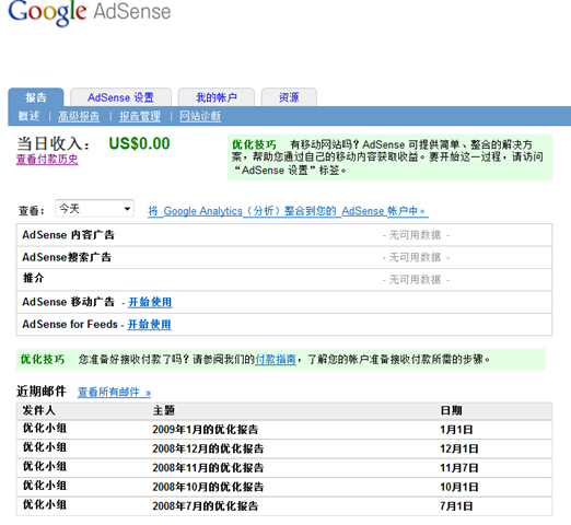 天哪!我折磨自己这么些天了,原来已经有帐户了,又郁闷又高兴。那会申请Google Adsense甚至不需要你有自己的网站!!!不说了,上图: